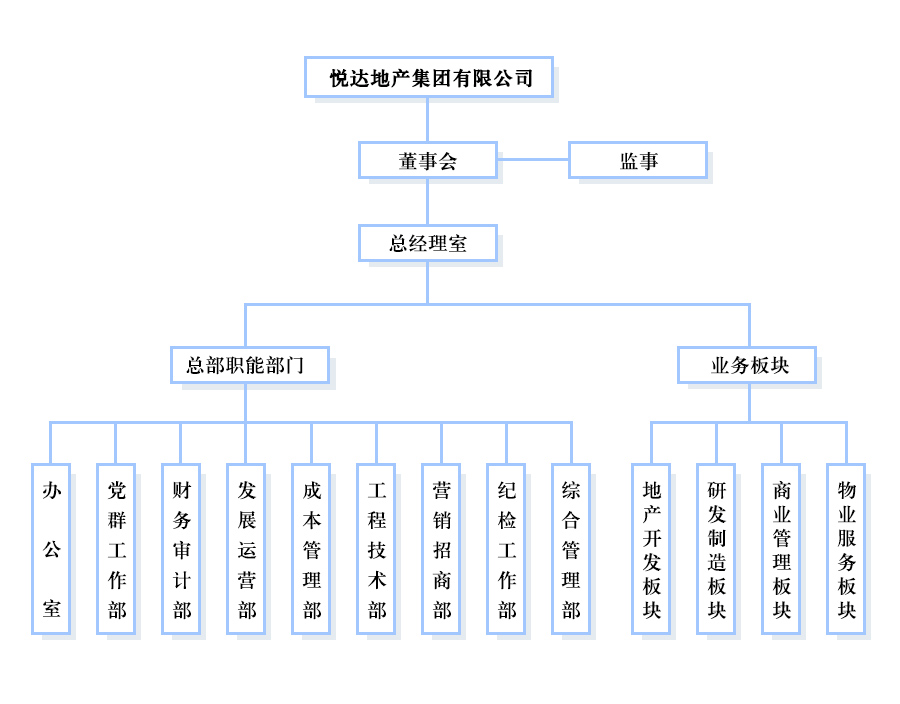 悅達(dá)地產(chǎn)實(shí)行董事會(huì)領(lǐng)導(dǎo)下的總經(jīng)理負(fù)責(zé)制,業(yè)態(tài)涵蓋房地產(chǎn)開發(fā)、商業(yè)管理、物業(yè)服務(wù)、研發(fā)制造等領(lǐng)域。擁有鹽城悅達(dá)置業(yè)發(fā)展有限公司、上海悅達(dá)房地產(chǎn)發(fā)展有限公司、江蘇悅達(dá)商業(yè)地產(chǎn)有限公司、江蘇悅達(dá)綠色建筑科技有限公司、悅達(dá)地產(chǎn)服務(wù)江蘇有限公司、悅達(dá)地產(chǎn)(東臺(tái))有限公司、上海悅致房地產(chǎn)發(fā)展有限公司等多家全資公司以及上海悅達(dá)新世紀(jì)發(fā)展有限公司、上海悅達(dá)悅享商業(yè)管理有限公司、江蘇萬科悅達(dá)實(shí)業(yè)有限公司、江蘇綠陽置業(yè)有限公司、西安悅達(dá)悅睿置業(yè)有限公司、悅達(dá)華美西安置業(yè)有限公司、常熟華坤房地產(chǎn)開發(fā)有限公司、淮安市新璀璨房地產(chǎn)有限公司、鹽城悅達(dá)天惠置業(yè)有限公司等數(shù)十家合資公司。