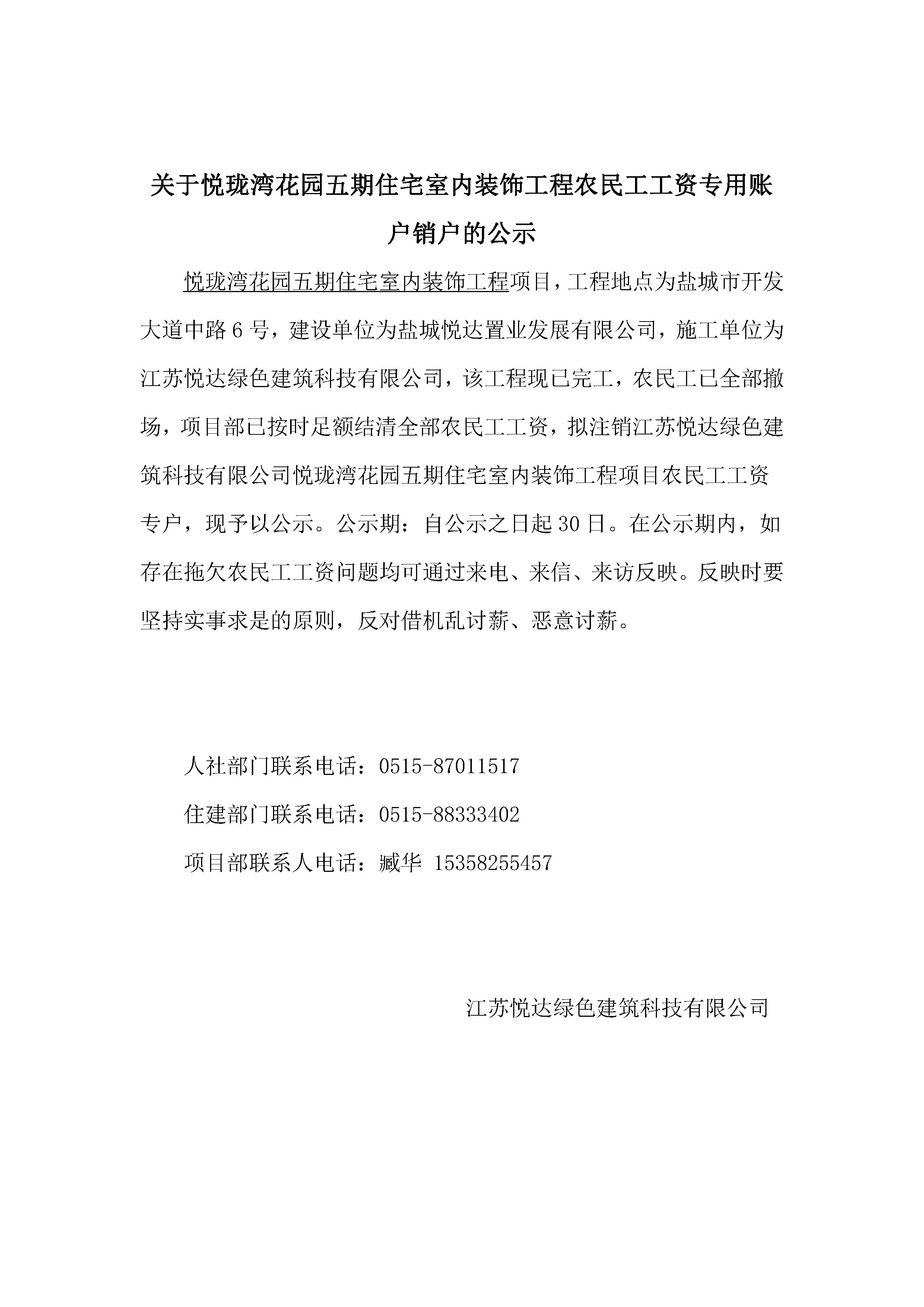 關于關于悅瓏灣花園五期住宅室內裝飾工程農民工工資專用賬戶銷戶的公示
