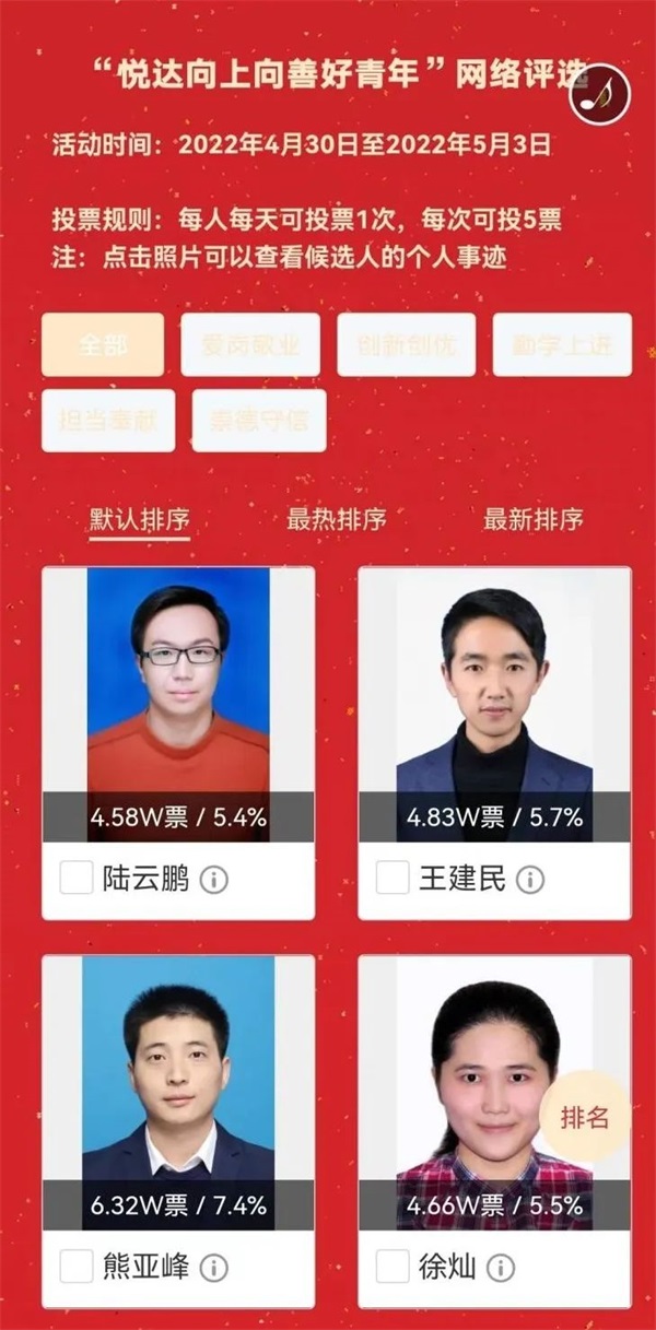 為了凝聚悅達(dá)榜樣力量,4月30日至5月3日,團(tuán)委開展了“悅達(dá)向上向善好青年”網(wǎng)絡(luò)評選活動,尋找“愛崗敬業(yè)好青年”、“創(chuàng)新創(chuàng)優(yōu)好青年”、“勤學(xué)上進(jìn)好青年”、“擔(dān)當(dāng)奉獻(xiàn)好青年”、“崇德守信好青年”代表。經(jīng)過激烈角逐,15名候選青年均獲得了上萬名網(wǎng)友的支持,合計(jì)獲得投票數(shù)84.9萬人次。
