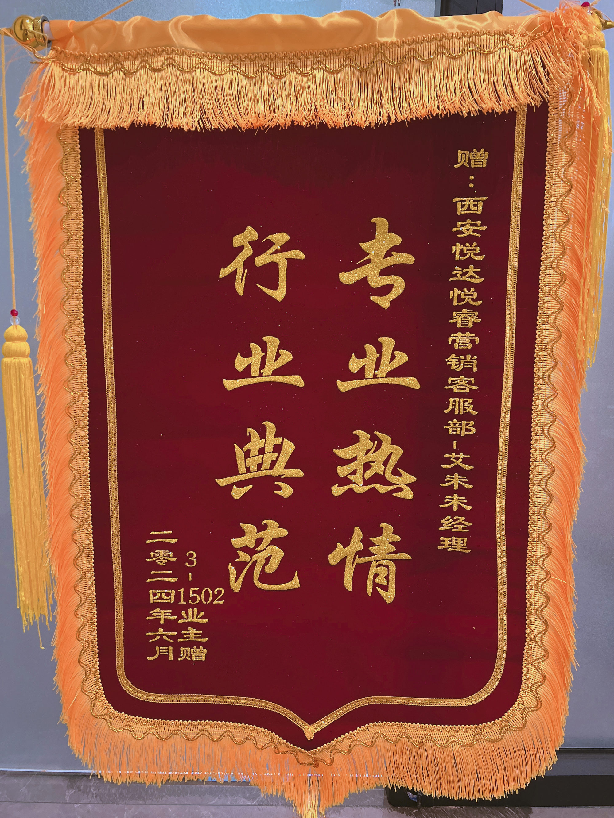 6月27日,西安悅睿公司客服條線(xiàn)經(jīng)理艾未未同志收到悅達(dá)&電建·玖璽臺(tái)項(xiàng)目業(yè)主,親自送來(lái)一面寫(xiě)有“高效服務(wù),真誠(chéng)待人”字樣的錦旗,以當(dāng)面感謝西安悅睿公司在幫助解決孩子順利入學(xué)上提供的巨大幫助。