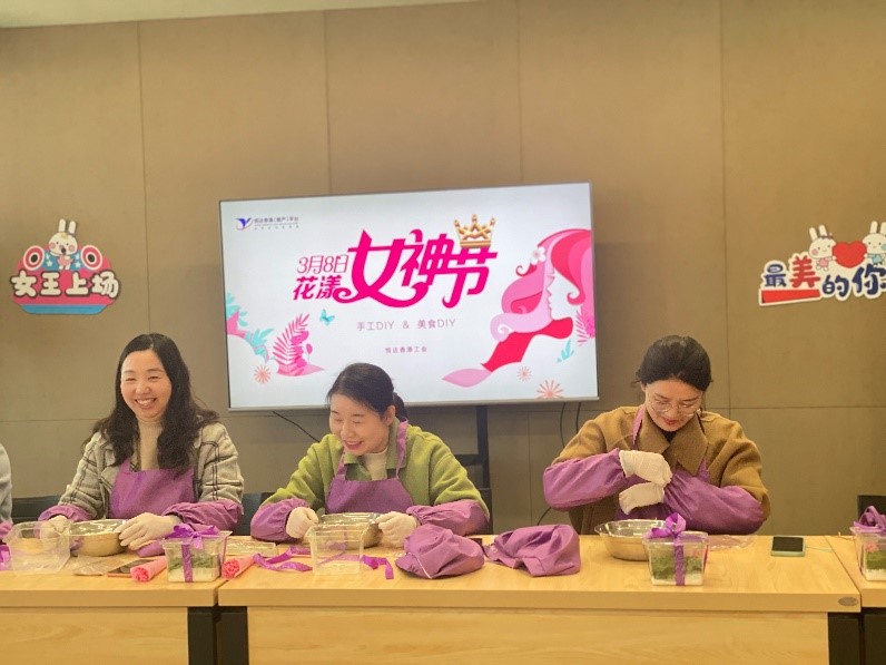 在地產總部,工會組織女職工開展了“永生花、木馬燈手工制作”活動,女職工們繪底板、擺圖案、精心設計、粘貼、調整,完成了一件件靚麗的手工作品。工會同時還舉辦了烘焙活動,女職工們分組協作、齊心協力,有人負責打蛋、有人忙著和面、有人執掌攪拌器、有人配好蛋糕紙杯,每個人都化身成了甜點大廚,現場氣氛活躍、香味四溢。