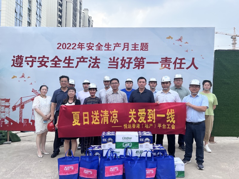 為做好夏日員工關愛、安全生產和防暑降溫工作,7月28日,平臺工會和安全生產條線深入悅達塞夫納、悅達匯文苑、悅達交投玖璽臺等項目一線,開展“夏日送清涼、關愛到一線”慰問活動,向堅守崗位的一線員工送去誠摯問候和清涼物資。